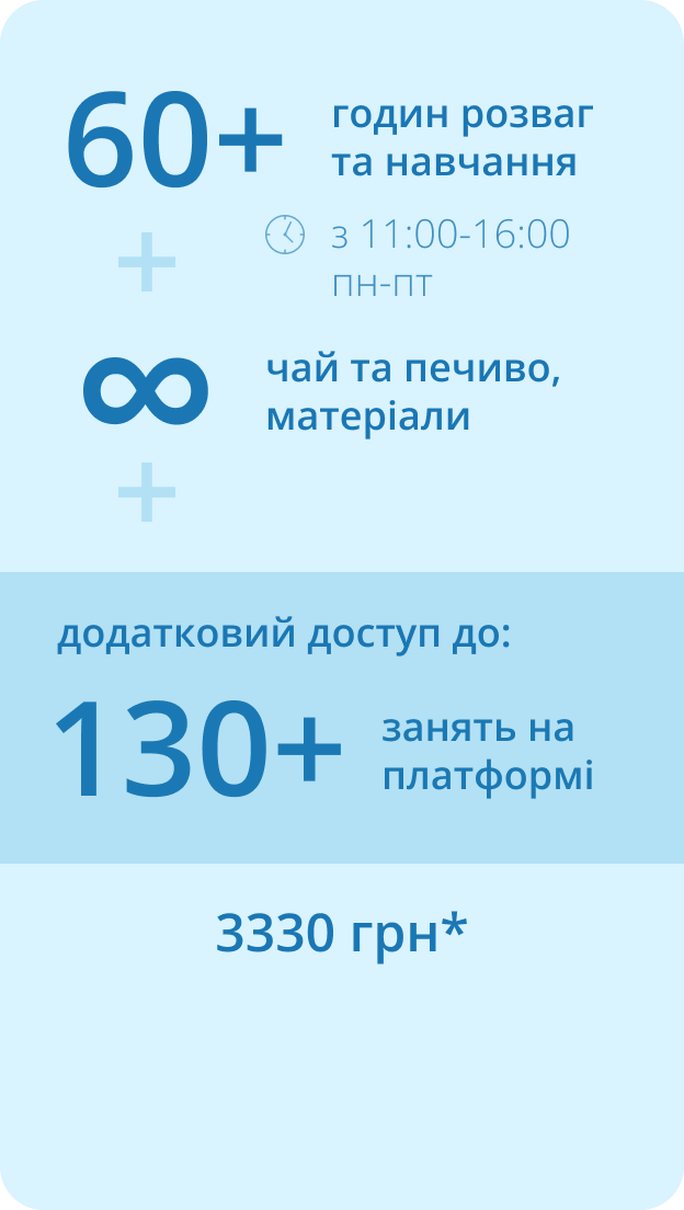 Також ви ознайомитеся з нашою методикою навчання, спробуєте інтерактивну платформу, зможете вибрати тариф та графік відповідно до ваших побажань. Урок проходить у зручний для вас час онлайн чи у школі. Тривалість: 30-50 хвилин.